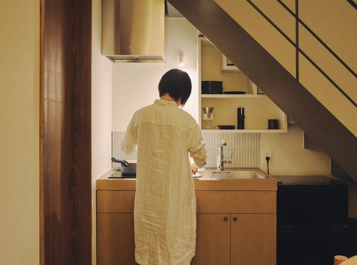 京都の静けさと現代的な快適さが調和した空間。キッチンや洗濯機を備えた上質な空間で、旅先でも自宅のようにお過ごしいただけます。